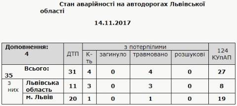 Протягом вівторка, 14 листопада, поліцейські зафіксували на Львівщині 31 аварію: у Львові – 20, на території області – 11 аварій.
