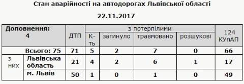 Протягом середи, 22 листопада, поліцейські зафіксували на Львівщині 71 аварію: у Львові – 50, на території області – 21 аварію.