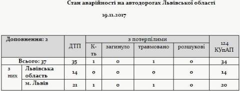 Протягом неділі, 19 листопада, поліцейські зафіксували на Львівщині 35 аварій: у Львові – 21, на території області – 14 аварій.