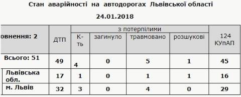 Протягом середи, 24 січня, поліцейські зафіксували на Львівщині 49 аварій: у Львові – 32, на території області – 17 аварій.