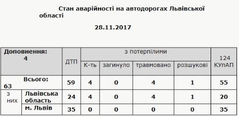 Протягом вівторка, 28 листопада, поліцейські зафіксували на Львівщині 59 аварій: у Львові – 35, на території області – 24 аварію.