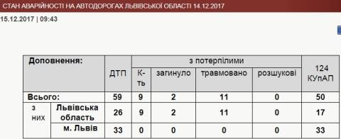 Протягом четверга, 14 грудня, поліцейські зафіксували на Львівщині 59 аварій: у Львові – 33, на території області – 26 аварій.