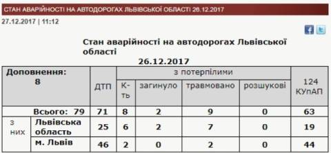 Протягом вівторка, 26 грудня, поліцейські зафіксували на Львівщині 79 аварій: у Львові – 46, на території області – 25 аварій.