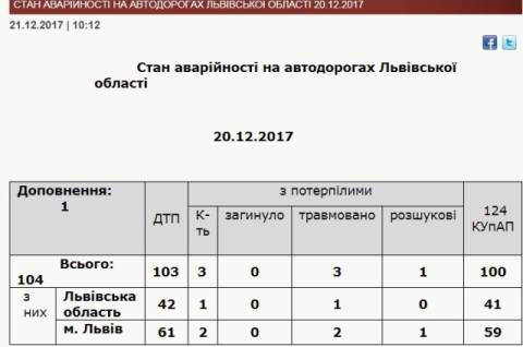 Протягом середи, 20 грудня, поліцейські зафіксували на Львівщині 103 аварії: у Львові – 61, на території області – 42 аварій.