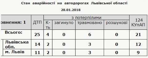 Протягом неділі, 28 січня, поліцейські зафіксували на Львівщині 25 аварій: у Львові – 11, на території області – 14 аварій.