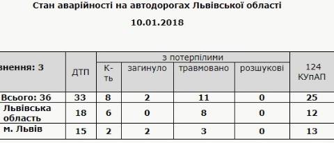 Протягом середи, 10 січня, поліцейські зафіксували на Львівщині 33 аварії: у Львові – 15, на території області – 18 аварій.
