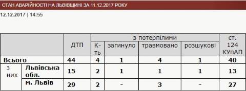 Протягом понеділка, 11 грудня, поліцейські зафіксували на Львівщині 44 аварії: у Львові – 29, на території області – 15 аварій.