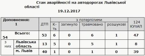 Протягом вівторка, 19 грудня, поліцейські зафіксували на Львівщині 53 аварії: у Львові – 40, на території області – 13 аварій.