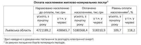 Загалом на кінець червня 2020 року заборгованість населення за постачання та розподіл природного газу становила 1565,5 млн грн, за постачання теплової енергії та гарячої води – 374,9 млн грн, за централізоване водопостачання та водовідведення – 128,6 млн грн, за управління багатоквартирним будинком – 135,4 млн грн.