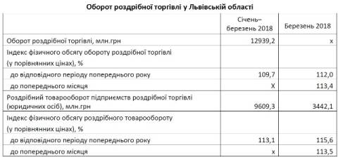 Зокрема, у січні-березні 2018 року обсяг обороту роздрібної торгівлі збільшився, порівняно із січнем-березнем 2017 року на 9,7% і становив 12,9 млрд грн.