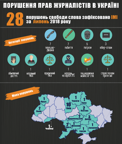 Згідно з результатами щомісячного моніторингу Інституту масової інформації "Барометр свободи слова", у січні-липні цього року в Україні зафіксували 63 випадки перешкоджань законній професійній діяльності журналістів, 22 випадки побиттів журналістів, 18 випадків погроз та 10 випадків обмеження доступу до інформації.