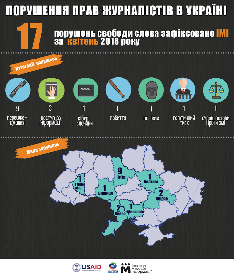 Згідно з результатами щомісячного моніторингу Інституту масової інформації "Барометр свободи слова", у квітні цього року в Україні зафіксували 17 випадків порушень прав журналістів і свободи слова.