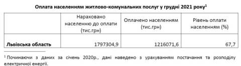 Загалом на кінець грудня 2021 року заборгованість населення за постачання та розподіл природного газу становила 2590,6 млн грн, за постачання теплової енергії та гарячої води – 652,9 млн грн, за централізоване водопостачання та водовідведення – 182,7 млн грн, за управління багатоквартирним будинком – 155,2 млн грн.