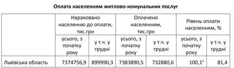 Загалом на кінець грудня 2019 року заборгованість населення за постачання природного газу становила 1993,7 млн грн, за централізоване опалення та постачання гарячої води – 497,5 млн грн, за утримання будинків і споруд та прибудинкових територій – 159,4 млн грн, за централізоване постачання холодної води та водовідведення – 85,5 млн грн.