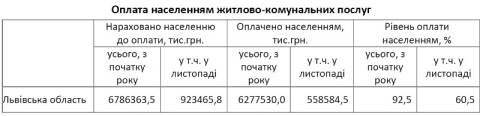 Загалом на кінець листопада 2018 року заборгованість населення за постачання природного газу становила становила 1774,1 млн грн, за централізоване опалення та постачання гарячої води – 369,6 млн грн, за утримання будинків і споруд та прибудинкових територій – 117,5 млн грн, за централізоване постачання холодної води та водовідведення – 51,3 млн грн.