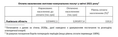 Загалом на квітня 2021 року заборгованість населення за постачання та розподіл природного газу становила 1968,9 млн грн, за постачання теплової енергії та гарячої води – 620,7 млн грн, за централізоване водопостачання та водовідведення – 160,6 млн грн, за управління багатоквартирним будинком – 134,9 млн.грн
