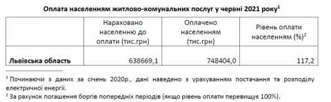 Загалом на кінець червня 2021 року заборгованість населення за постачання та розподіл природного газу становила 1734,5 млн грн, за постачання теплової енергії та гарячої води – 410,7 млн грн, за централізоване водопостачання та водовідведення – 171,2 млн грн, за управління багатоквартирним будинком – 141,4 млн грн.
