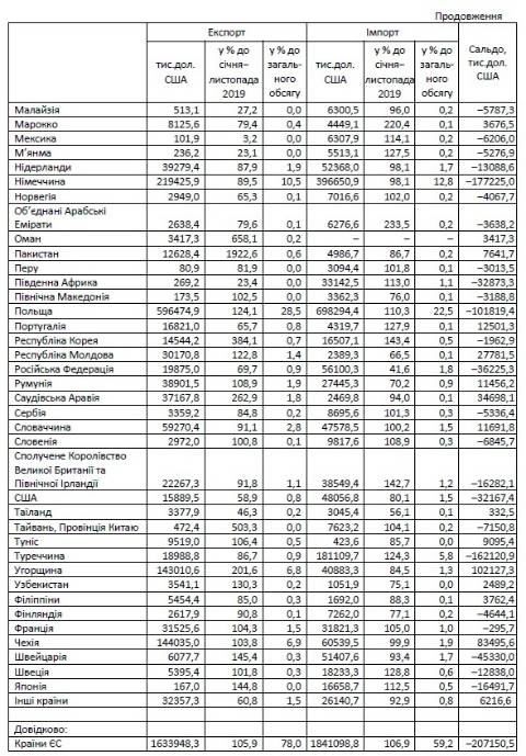 Підприємства області здійснювали зовнішньоторговельні операції з партнерами із 169 країн світу. Найбільші частки експортованої продукції припали на Польщу (28,5% від загальнообласного експорту), Німеччину (10,5%), Чехію (6,9%) та Угорщину (6,8%). Експорт товарів у країни Євросоюзу становив 1633,9 млн дол (78%) і збільшився, порівняно з січнем-листопадом 2019 року, на 5,9%.