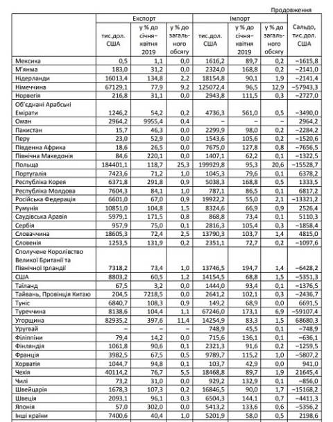 імпорту), Німеччину (12,9%) та Китай (10,1%). Імпорт товарів з країн Євросоюзу становив 555,7 млн дол (57,3%) та зменшився, порівняно з січнем-квітнем 2019 року, на 1,4%.