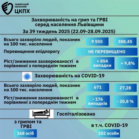 Натомість кількість хворих на ГРЗ становить 9 555 осіб. Попереднього тижня зафіксували 8 701 людину з ГРЗ. До лікарень госпіталізували 168 хворих.