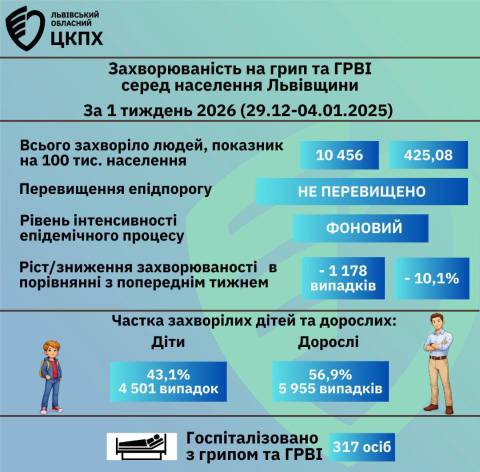 За минулий тиждень, з 29 грудня до 4 січня, на грип та ГРВІ в області захворіли 10 456 осіб, що на 1 178 випадків або на 10,1% менше, ніж за попередній тиждень (тоді захворіли 11 634 особи).