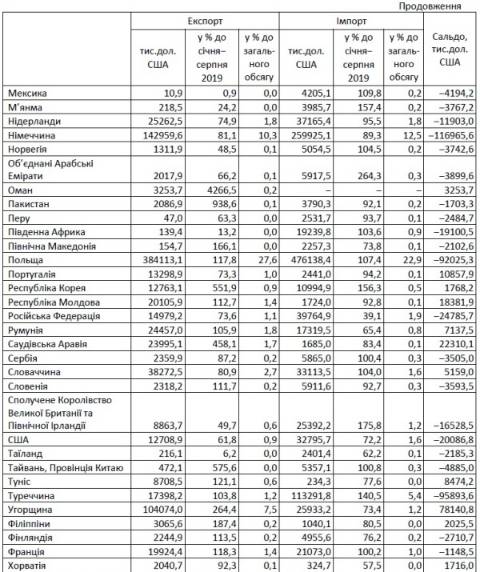 Підприємства області здійснювали зовнішньоторговельні операції з партнерами із 167 країн світу. Найбільші частки експортованої продукції припали на Польщу (27,6% від загальнообласного експорту), Німеччину (10,3%) та Угорщину (7,5%). Експорт товарів у країни Євросоюзу становив 1062,6 млн дол (76,3%) і зменшився, порівняно з січнем-серпнем 2019 року, на 1,8%.