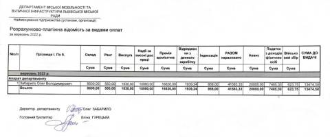 У вересні цього року директору департаменту міської мобільності та вуличної інфраструктури Львівської міськради Олегу Забарилу нарахували 41 583,33 грн заробітної плати. Зокрема, у цю суму увійшли такі виплати: