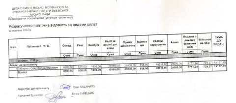 У жовтні цього року директору департаменту міської мобільності та вуличної інфраструктури Львівської міськради Олегу Забарилу нарахували 48 618 грн заробітної плати. Зокрема, у цю суму увійшли такі виплати: