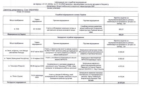Починаючи з 1 січня й до 31 грудня 2023 року директор департаменту міської мобільності та вуличної інфраструктури Львівської міської ради Олег Забарило побував у 5 службових відрядженнях, з них 1 відрядження було у межах України, а 4 – закордонні.