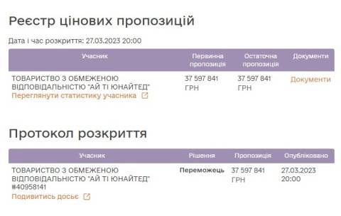 Аукціон відбувся вчора, 27 березня, держпідприємство придбала за 37 597 841 грн фірма ТзОВ "Ай Ті Юнайтед", що лише трохи більше за початкову вартість закупівлі у 37 297 841 грн.