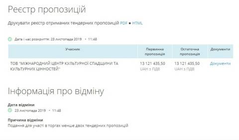Аукціон стартував 19 листопада цього року, однак на нього подався лише один учасник – ТОВ "Міжнародний центр культурної спадщини та культурних цінностей", що є недостатньо для проведення торгів, тому закупівлю відмінили.