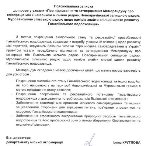 "З метою покращення екологічного стану та рекреаційної привабливості Гамаліївського водосховища, враховуючи потребу у взаємній співпраці щодо розвитку цієї території, міська рада ухвалила: затвердити Меморандум про співпрацю між Львівською міською радою, Новояричівської селищною радою, Мурованською сільською радою щодо намірів знайти спільні шляхи розвитку Гамаліївського водосховища" – вказано у проєкті ухвали.