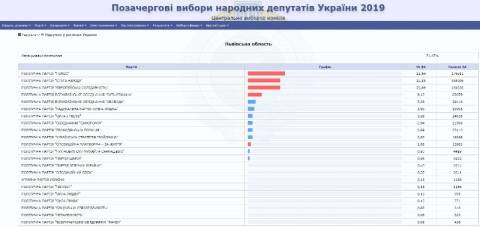 За даними Центральної виборчої комісії, станом на 15:25 год опрацювали 74,47% виборчих бюлетенів у Львівській області. Лідирує партія "Голос", яка набрала 23,64% голосів і її підтримали 176 311 мешканців області, натомість за партію "Слуга народу" проголосували 21,18% або 158 005 виборців.