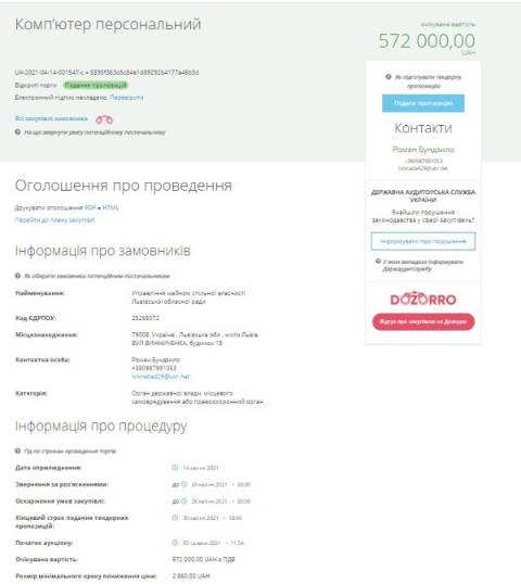 Управління майном спільної власності Львівської облради вдруге замовило 22 комп'ютери за 572 тисяч гривень.