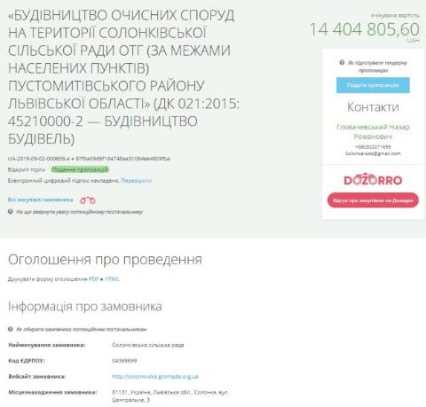 Солонківська сільська рада оголосила тендер у системі ProZorro на будівництво очисних споруд на території села Солонка Пустомитівського району, що знаходиться поблизу Львова, яке переможець тендеру має здійснити до 31 грудня 2020 року.