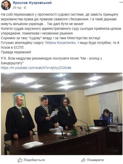 Готуємо з Тетяною Козаченко апеляційну скаргу. І якщо буде потрібно, то й позов у Європейський суд з прав людини," – заявив Жукровський.