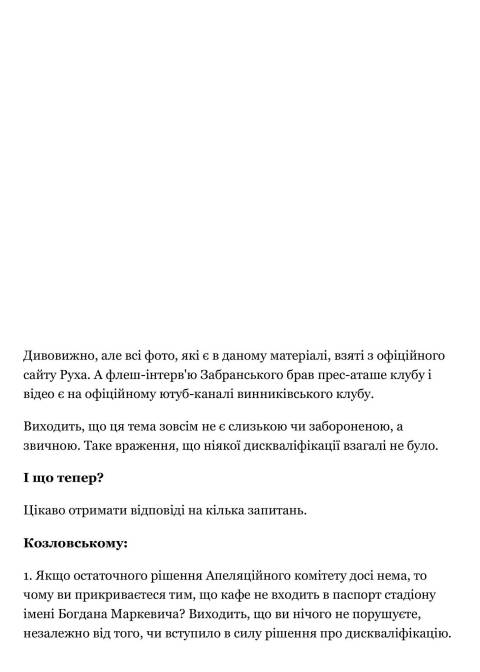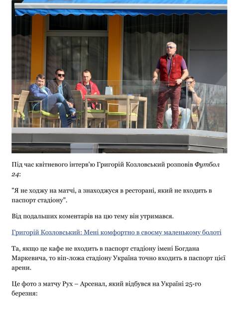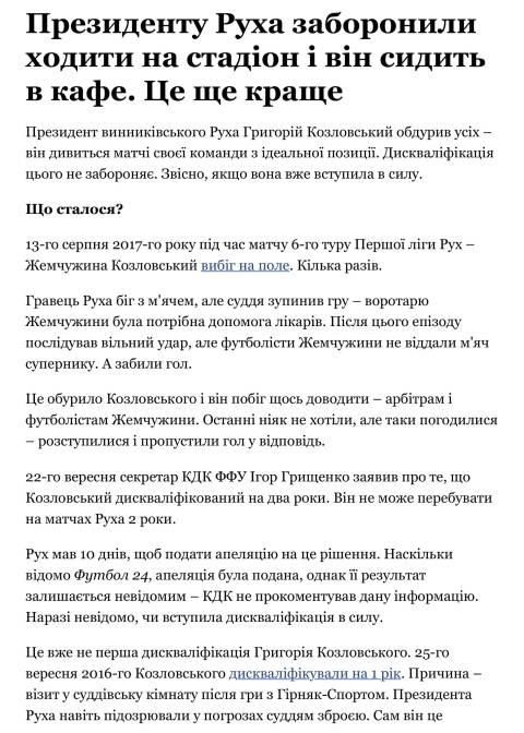 Учора, 24 травня, стало відомо про те, що з сайту "Футбол 24" видалили (разом із кешами) матеріал журналіста Андрія Сеньківа під назвою "Президенту Руха заборонили ходити на стадіон і він сидить в кафе. Це ще краще". У репортажі, скріншоти якого зберігли журналісти видання Tribuna.com, мова йшла про підприємця, президента ФК Рух Григорія Козловського, який свого часу здобув дискваліфікацію за те, що в серпні 2017 року декілька разів вибіг на поле під час одного з матчів. Тепер президент винниківського Руха дивиться матчі своєї команди з кафе. У матеріалі підкреслюється, що дискваліфікація цього не забороняє.