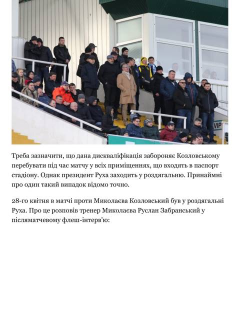 Нагадаємо, торік 13 серпня під час матчу Рух-Жемчужина Козловський вибіг на поле та порушив перебіг матчу. За це він отримав дискваліфікацію. А у 2016 році Григорій Козловський також отримав річну заборону від КДК ФФУ на відвідування матчів Руху за погрози розправитися із арбітрами, після програшу своєї команди у Кубку України.