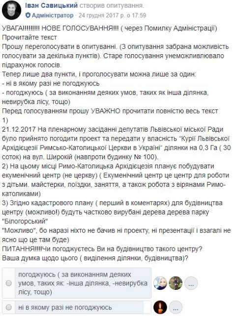 У Facebook-спільноті присвяченій львівському мікрорайону Левандівка триває онлайн-голосування щодо будівництва у мікрорайоні римо-католицького сакрального комплексу.