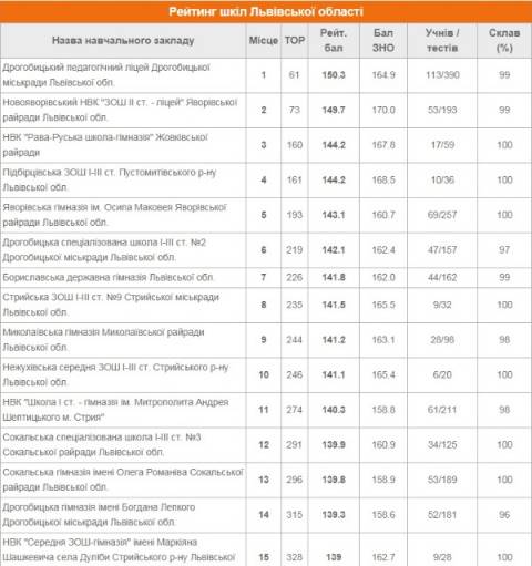 Зокрема, на перших місцях опинилися: Дрогобицький педагогічний ліцей (рейтинговий бал – 150,3), Новояворівський НВК "ЗОШ ІІ ст. – ліцей" (рейтинговий бал – 149,7), НВК "Рава-Руська школа-гімназія" (рейтинговий бал – 144,2), Підбірцівська ЗОШ І-ІІІ ст. (рейтинговий бал – 144,2), Яворівська гімназія ім. Осипа Маковея (рейтинговий бал – 143,1), Дрогобицька спеціалізована школа І-ІІІ ст. №2 (рейтинговий бал – 142,1).