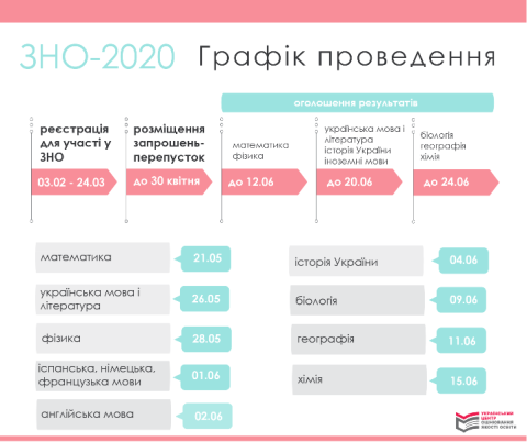 Зовнішнє незалежне оцінювання в Україні у 2020 році відбудеться з 21 травня до 15 червня. Згідно з графіком, реєстрація стартує з 3 лютого до 24 березня.