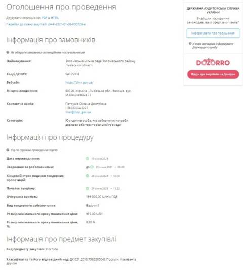 Золочівська міська рада Золочівського району Львівської області оголосила тендер у системі ProZorro на послуги з розміщення статей та оголошень в друкованих засобах масової інформації, які переможець тендеру має поставити до 31 грудня 2021 року.