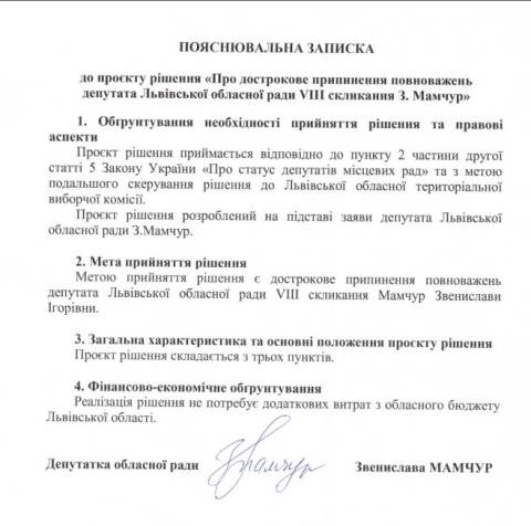 Проєкт рішення розроблений на підставі заяви Мамчур від 25 листопада цього року про складання депутатських повноважень.